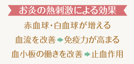 お灸は熱刺激により赤血球や白血球を増やし、血流を改善して免疫力を高めます。そして血小板の働きを改善し止血作用も促します。また、鍼で気を動かしてから灸をすることで、効率よく血を動かすことができます。