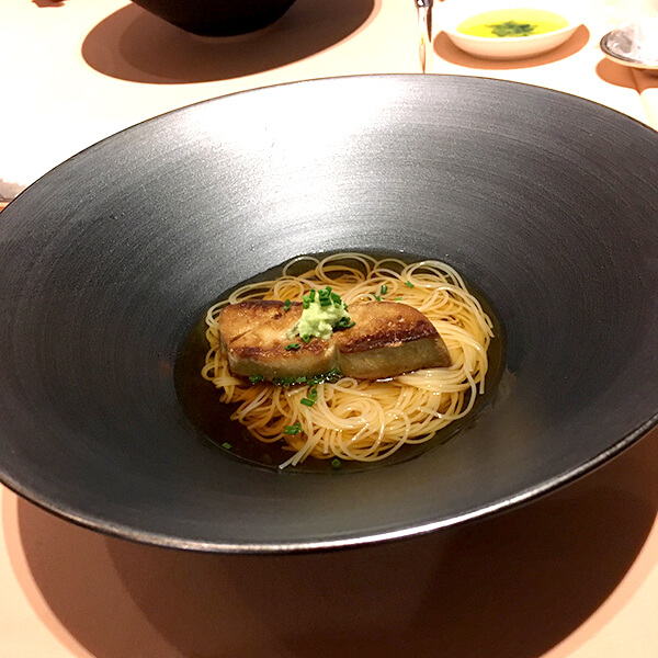 まずは、アミューズ“焼きとうもろこしと鴨のマリネ”から