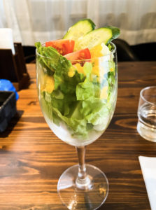 おしゃれにワイングラスに入ったサラダから始まり、コンソメスープ、そしてメイン